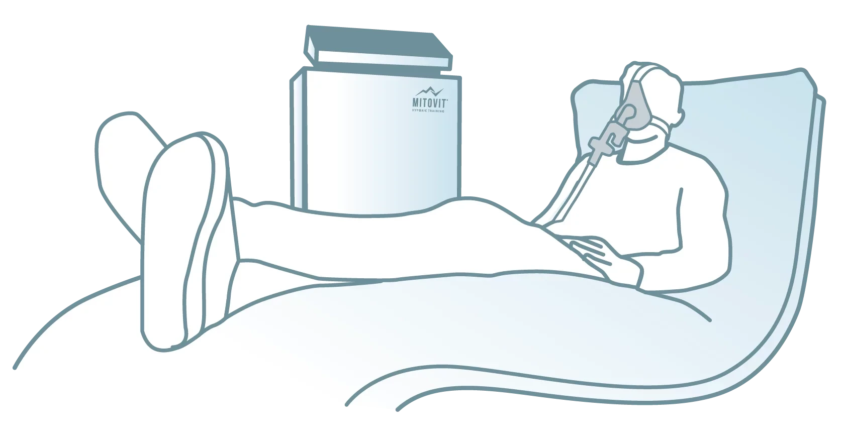 MITOVIT® Hypoxietraining findet in der Praxis in einer entspannten Situation im Liegen statt. Die Anwendung wird als angenehm empfunden und führt bei vielen dazu, dass sie währenddessen entspannen und einschlafen. Im Gegensatz zum Höhentraining der Sportler, findet während des Hypoxietrainings in der Regel keine sportliche Aktivität statt. Um die Reize der physischen Belastung nachzuahmen, wird beim MITOVIT® Hypoxietraining mit einer stärker reduzierten Sauerstoffkonzentration gearbeitet. In der Regel findet ein Höhentraining der Sportler auf einer Höhe von ca. 2.000 Metern statt, welches einem Luftsauerstoff von ca. 16 % entspricht. Sportler, die eine Ergänzung suchen, um ihre Leistungsfähigkeit zu steigern, sollten das Hypoxietraining mit MITOVIT® während moderater körperlicher Belastung durchführen, beispielsweise auf dem Fahrrad oder dem Laufband.